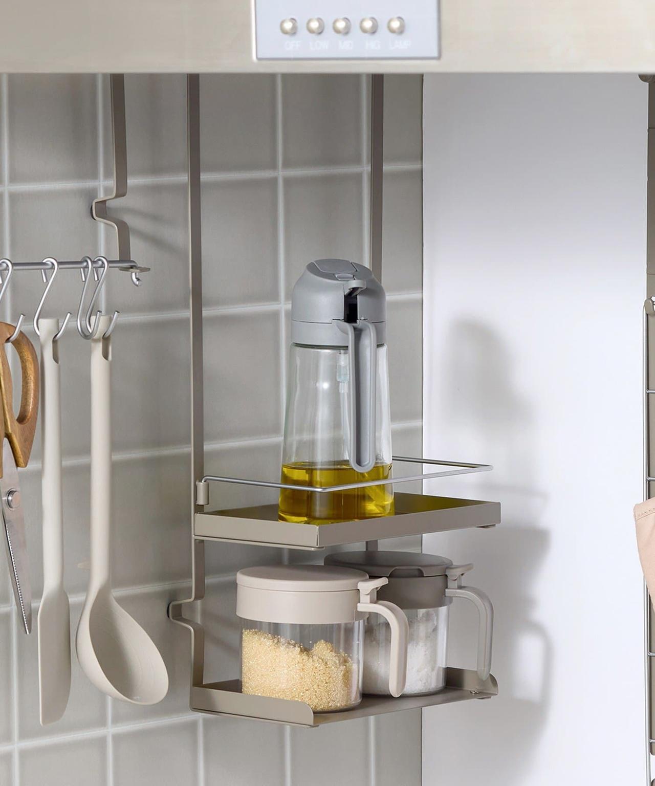 「レンジフードスパイスラック2段/ KITINTO」¥1,100(税込)は、換気扇の縁を利用する収納グッズです。上部には高さのある油などを、枠がない下段にはサッと手に取りたい小瓶のスパイス類を並べるのに適しています。アジャスターで固定するだけの簡単設置が可能なため、壁に傷をつける心配いらずかも。