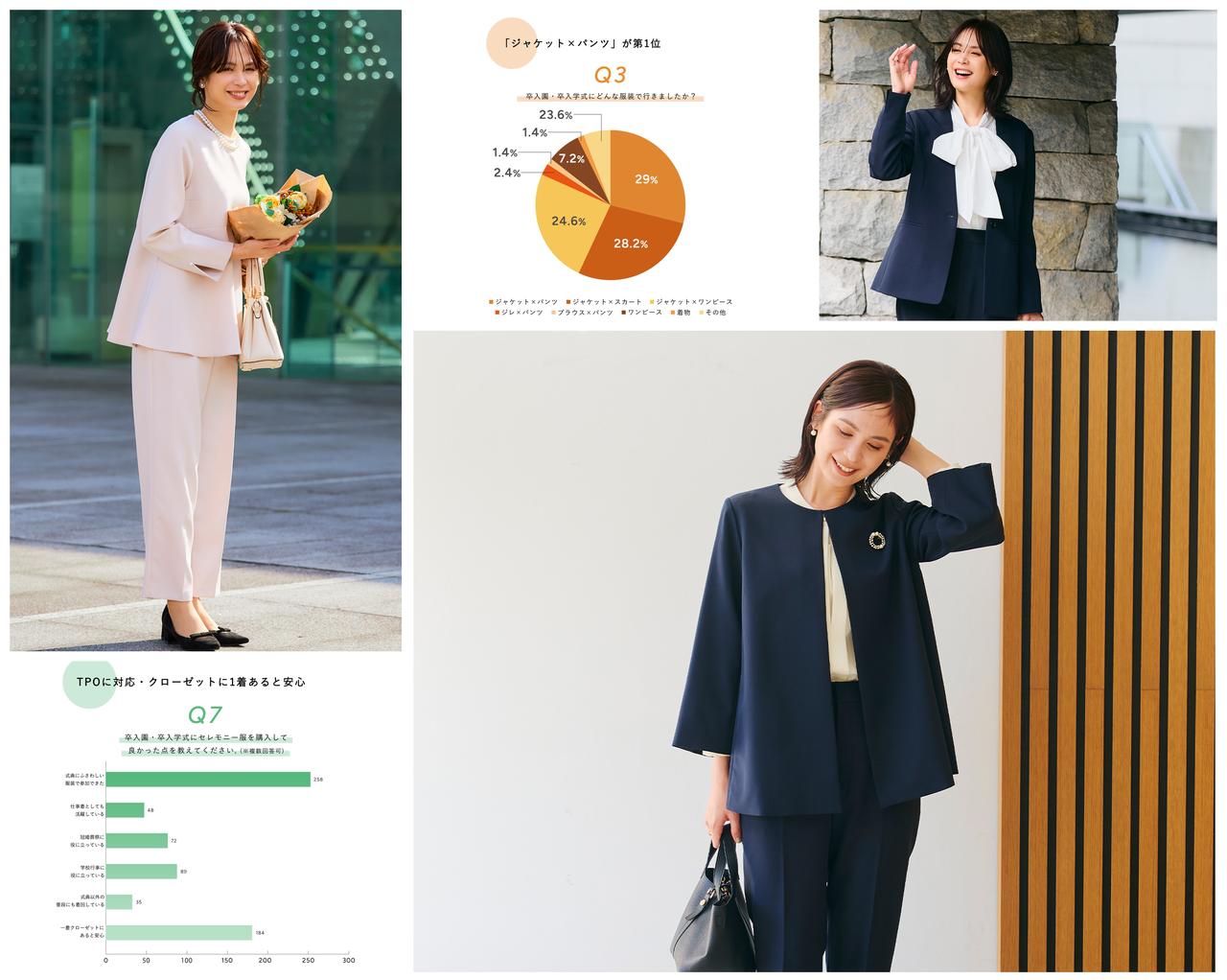3月に行われる卒園式・卒業式と、4月の入学式で1着のセレモニースーツを着回している割合は約7割。インナーを別アイテムにするだけでも印象や気分が変えられるので、セットアップで揃えておくと便利なのかもしれません。
