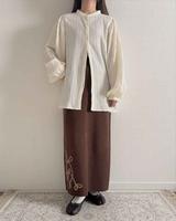 先ほどのスカートと同じシフォン素材ですが、こちらは女性らしい花柄をオン。上品な小花柄で、大人女性でも気兼ねなく取り入れられそうなデザインに仕上がっています。あえてデニムやスウェットなどのカジュアルなトップスと合わせると今っぽく仕上がりそう。