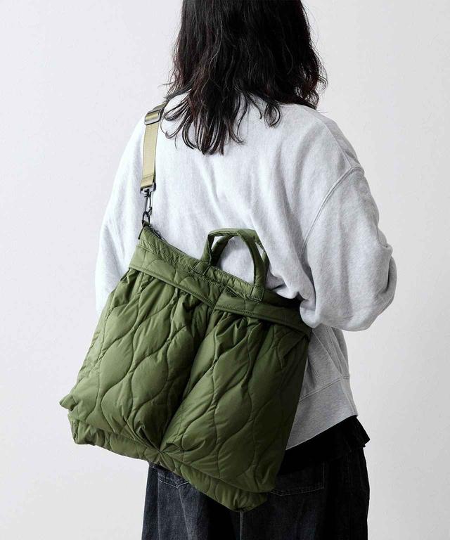 メンズライクなミリタリーデザインが魅力のバッグ。キルティング素材がボリューミーで、コーデのおしゃれなポイントに。約高さ43 × 幅43cmの大きめサイズなので書類やノートPCが入る収納力があり、オンオフ問わず活躍しそう。バッグの内側は鮮やかな配色になっており、ちら見えしてもおしゃれ。大きめのアウトポケットも付いていて、お値段以上と言えそうな高見えバッグです。