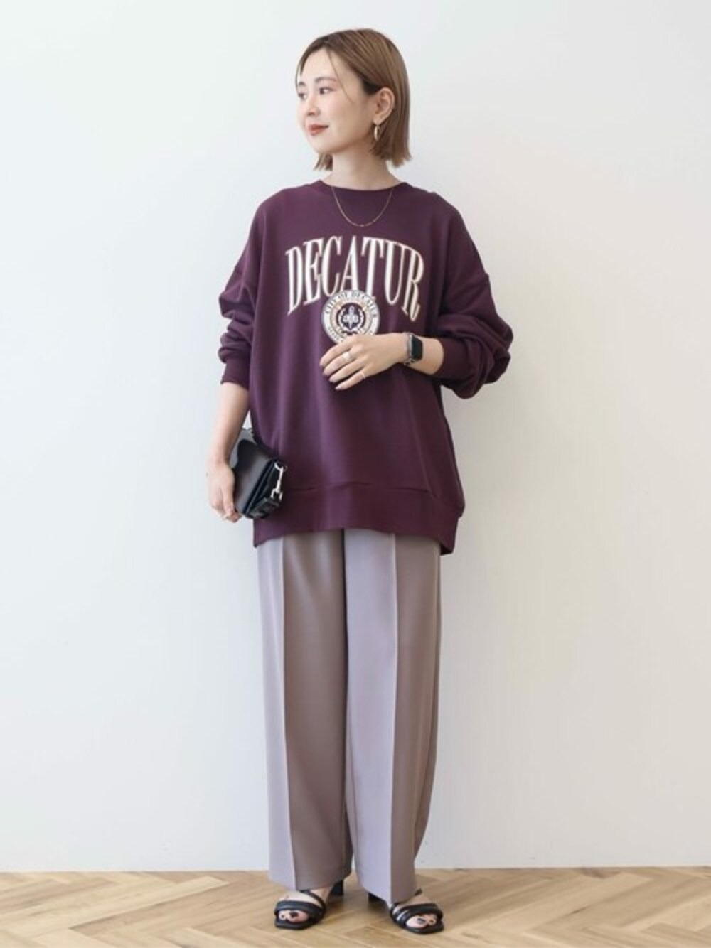 楽に着られるスウェットシャツも、今シーズンはブラウンを選べばトレンド感UP。大人コーデにも取り入れやすいカラーです。こちらはフロントのロゴデザインが存在感を放ち、1枚でコーデの主役に。ラフになりすぎないよう、@kanana110さんのようにセンタープレス入りのパンツで大人っぽく仕上げるのがポイントです。