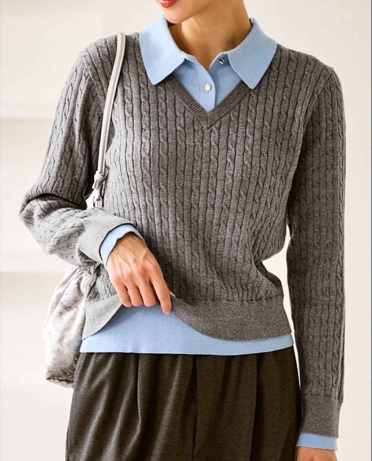 Vネックセーターとシャツを重ね着したようなデザインで、1枚でサマ見えが狙えるトップス。立体的なケーブル編みが、季節感のあるコーデに仕上げてくれそうです。レイヤード風の襟や袖なども実はニット素材で、暖かな着心地が期待できます。