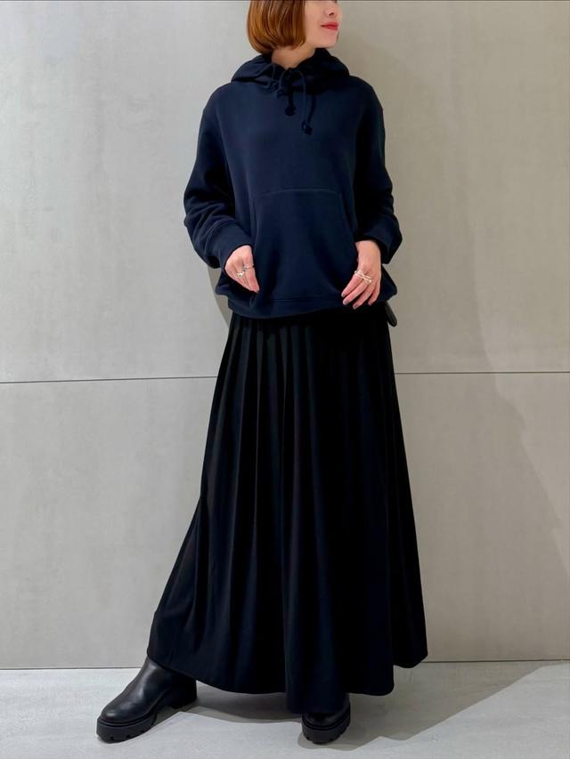 カジュアルなフーディーも、ロングスカートを合わせるだけで一気に女性らしいムードにシフト。歩くたびに揺れるスカートの質感が、品の良さを感じさせてくれるスタイリングです。足元は黒ブーツで引き締めると、シャープな印象に。ラフさときれいめのバランスが絶妙で、無理なく“今っぽい大人カジュアル”が完成します。