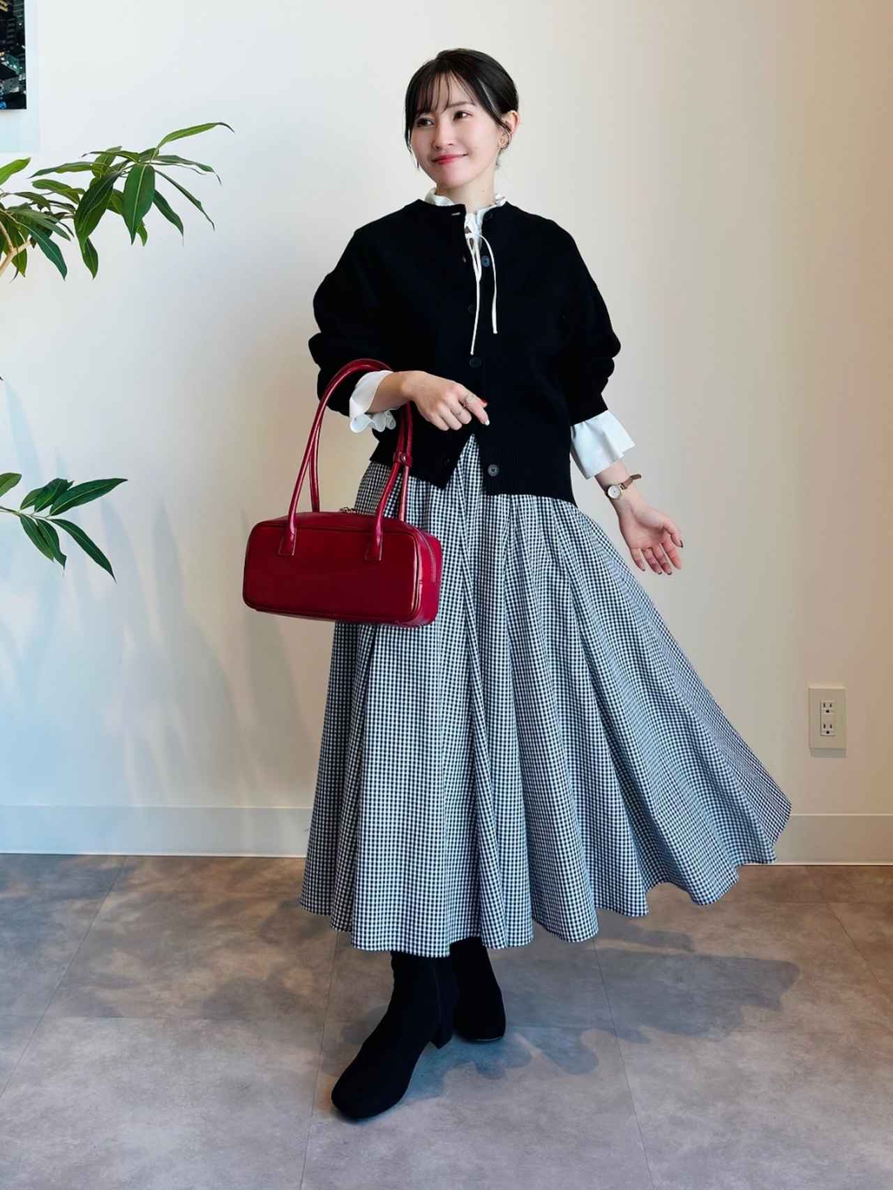 スカートは全4色で、ブルー・ブラック・オフホワイトの無地に加え、甘く可愛いギンガムチェック柄もラインナップ。愛らしい印象のチェック柄も、落ち着いた配色のおかげで子どもっぽく見えにくく、大人コーデにすっとなじみます。ブラックカーデとの組み合わなら、上品さと可愛さが共存するようなきれいめカジュアルに。脚のラインをうまくカバーしてくれそうなのも、うれしいポイントです。