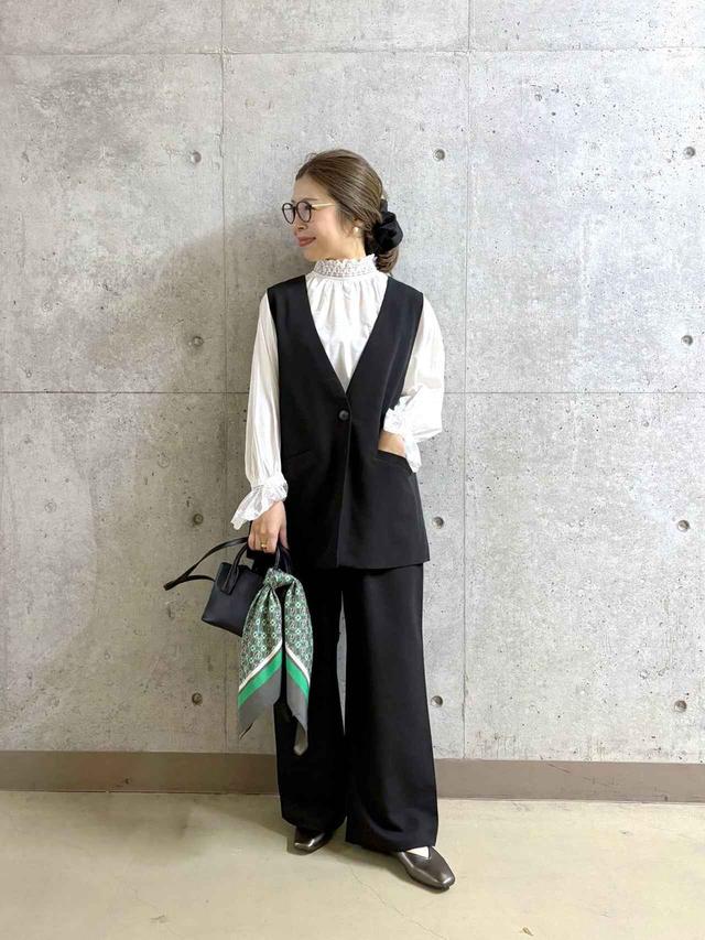 オケージョンシーンにふさわしいアイテムの基本はシンプル寄りのデザイン。スタッフのMINAKOさんは、装飾を省いたロングベストとワイドパンツをセットアップで着用。スナップのようにインナーにフェミニンなブラウスを合わせれば、きちんと感が漂うオケージョンコーデに。インナー次第でオンにもオフにも活躍しそうです。もちろん、セットアップはそれぞれ単体でも使いやすいから、上下揃えておけばデイリーコーデの幅もグッと広がる予感。