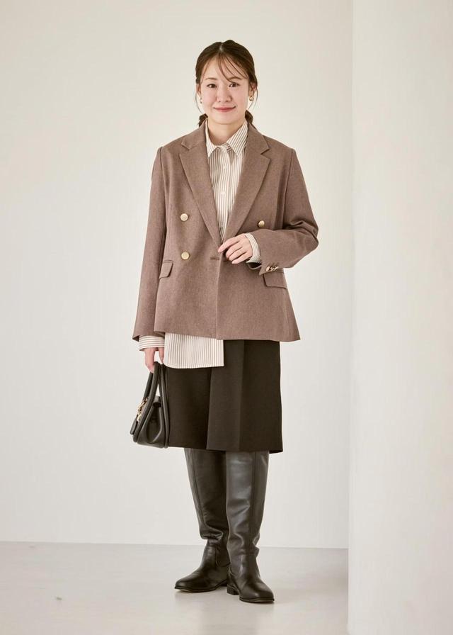 フロントにタックを施して、クリーンな印象に仕上げたハーフパンツ。短すぎない程よい丈感なので、大人女性も穿きやすそうです。ストレッチ素材が使われているため、窮屈感が気になる人にもおすすめ。クラシカルなテーラードジャケットと合わせれば、よりきちんと感のある上品コーデに。足元はロングブーツでクールに決めるのも、きれいめに見せるポイント。