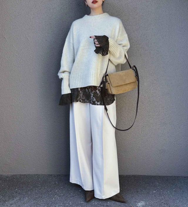 清潔感のある淡色アイテムですが、ワントーンでまとめるとなんだか地味見え……。そんなときは、濃色のインナーをレイヤードしてメリハリをつけてみて。トレンド感のあるレース素材なら、クールなパンツスタイルも女性らしい雰囲気に。袖口と裾から見える繊細な表情が、コーデに華やぎを与えてくれます。パンツにボリュームがあるので、足元は華奢なシューズですっきりまとめるのがベター。