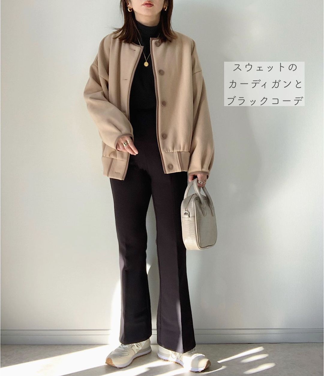 今回紹介するのは、「2WAYストレッチフレアパンツ」のブラックカラー。張り感のある綺麗めなシルエットながら、着心地抜群の優秀アイテムなんです。裾はフレアになっていて、脚のラインを綺麗に見せてくれるという嬉しい効果も◎ シンプルなカーデと合わせるだけでも、しっかりサマ見えしてくれます。