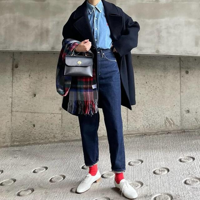 上下同じトーンで合わせるデニム オン デニムに慣れてきたら、ライトブルー × ネイビーの組み合わせに挑戦してみて。明るく爽やかな印象を与えるライトブルーデニムシャツで、暗くなりがちな冬の装いも鮮度アップ。アクセントカラーにレッドソックスを投入して、配色センスが光るコーデを目指して。