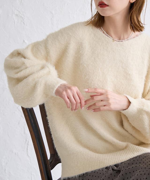 毛足の長いシャギー素材が上品な華やかさを演出、トレンド感アップも狙える【ROPÉ PICNIC(ロペピクニック)】の「シャギーVネックニットプルオーバー」¥4,939(税込)。開きすぎないVネックデザインできちんと見えするセーターは、オンにもオフにも活躍しそう。チャコール・キナリ・サックス・ピンクの4色展開。