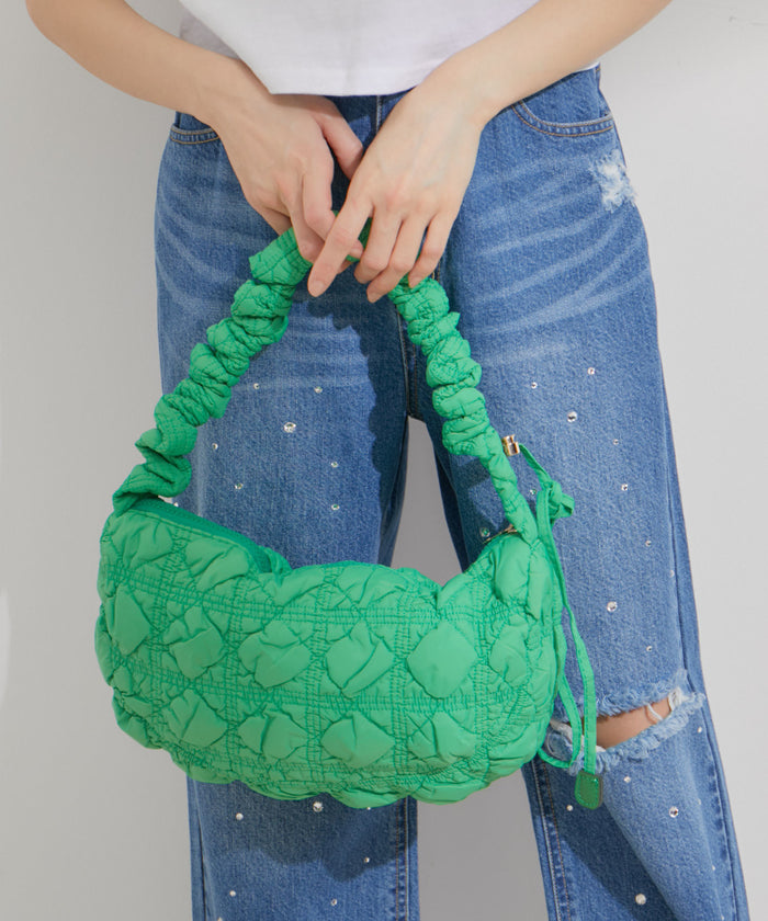 遊び心のあるくしゅくしゅのキルティング素材が特徴の「キルティングくしゅくしゅショルダーバッグ」¥4,939(税込)。ボディだけでなく持ち手部分までくしゅくしゅとさせた遊び心のあるデザインが光ります。軽量のナイロン素材でさらっと持てそうなのも嬉しいポイント。外ポケット付きなので、細かいものも収納できて使いやすそうなのも◎