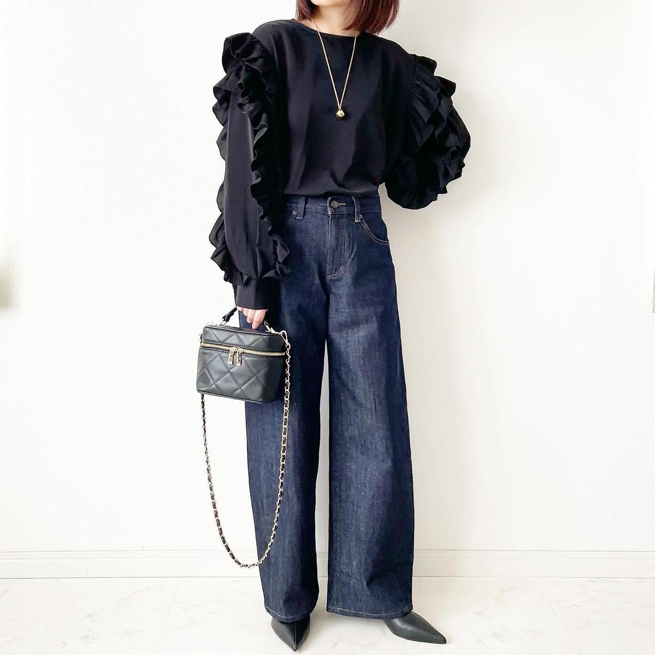 ボリュームたっぷりのフリル袖がロマンティックなブラウスは、トレンドのワイドジーンズと合わせて今っぽく着こなすのが気分。トップスをタックインして着こなすと、シルエットにメリハリが生まれ好バランスに決まりそうです。バッグやシューズは上質感たっぷりのアイテムを合わせたら、センス良い!と噂になりそうなスタイリングが完成です。