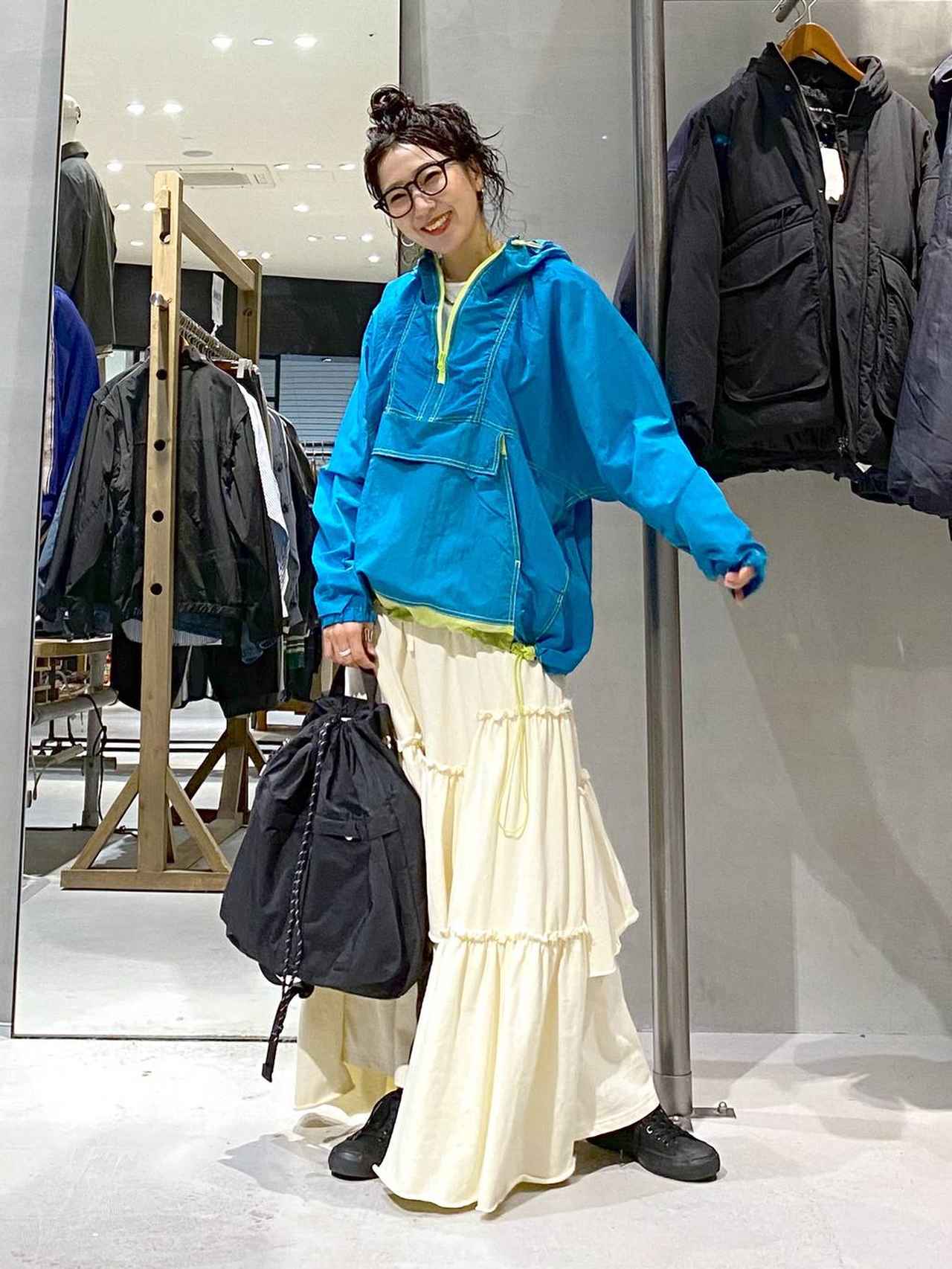 鮮やかなブルーにグリーンの差し色を効かせたアノラックパーカーが主役のコーデ。幼く見えがちで大人女子には難しそうなアイテムですが、Misayoさんのように他のアイテムは落ち着いたカラーでまとめることで、バランスの良いカラーコーデにシフト。ティアードスカートを合わせてテイストミックスすれば、フェミニンなカジュアルコーデが完成しそうです。