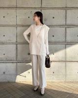 脚のラインを拾わずにスッキリと着こなせる「ストレートデニムパンツ」¥6,600(税込)。やや高めに設計したウエストラインで、脚長効果も期待大。切りっぱなしにした裾がこなれ感も演出します。ジャケットを合わせてキレイめカジュアルに、デコラティブなブラウスを合わせて大人可愛く着こなすのもおすすめ。