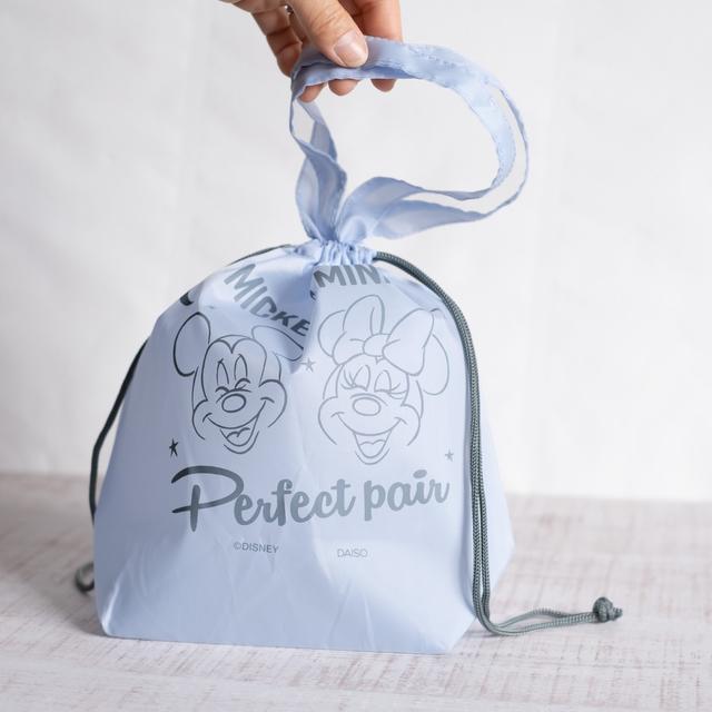 明るく爽やかなペールブルーが春ムードを盛り上げる「巾着トートバッグ(ミッキー & ミニー)」¥110(税込)。ミッキー & ミニーの無邪気な笑顔がたまらなく可愛くて、こちらも思わず顔がほころびます。マチがしっかりあるので、見た目以上の収納力を発揮してくれそう。お弁当箱入れにも重宝しそうです。