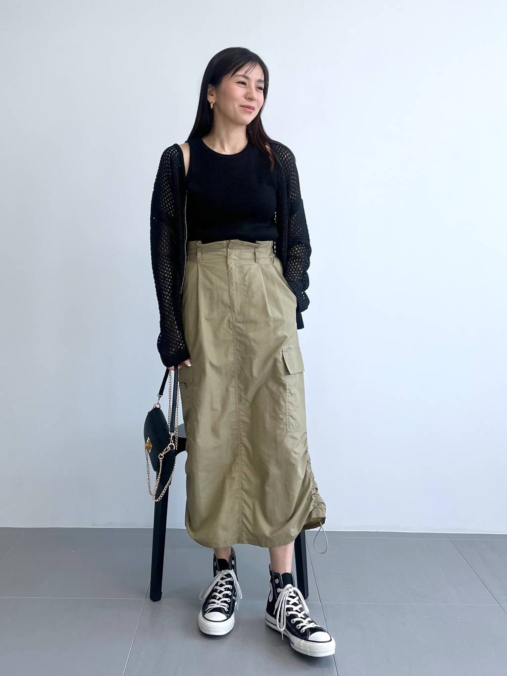 ミリタリーテイストなカーゴスカートは、カジュアルになりすぎそう……。そんなときは、Natsumiさんのように他のアイテムをオールブラックでまとめてモードに着こなすのがおすすめ。メッシュカーデでセンシュアルな雰囲気をまとって、スニーカーでスポーティな要素をプラスすれば、最旬コーデを楽しめそう。
