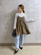 程よい厚みのあるジャンパースカートに、ボーダ柄の長袖Tシャツを合わせたコーディネート。深めのVネックでレイヤードしやすく、合わせるアイテムによって幅広い着こなしを楽しめそうです。ボーダー柄を合わせることでカジュアルな雰囲気に。寒い日にはニットセーターやタートルネックを相棒に選べば、暖かく過ごせそうです。