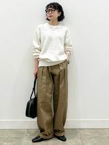 ドルマンスリーブのゆるりとしたシルエットがこなれ感を発揮するロゴトップスは、着丈が長すぎず、小柄さんもバランスを取りやすいのがポイント。小柄さん向けにリリースされている「フクレジャガードタイトスカート」¥1,980(税込・セール価格)を合わせれば、グッとフェミニンな印象が高まります。足元は淡色のブーツでキレイめにまとめるのがGOOD。