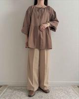 リネンワンピは一つ前のオフホワイトのほか、ニュアンスカラーがおしゃれなグレーもラインナップ。こちらは太めのストライプ柄です。ゆったりと丈の長いカフタン、スタンドカラーやドレープ感など、こなれ感のあるスタイルを叶えるこだわりが随所に。なにかと便利なサイドシームポケット付きなのも嬉しいポイントです。