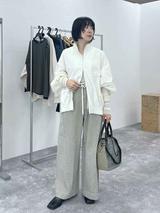 肩や二の腕にピタッとフィットしすぎないデザインは、正面から見た際にも腕まわりがすっきりとした着こなしを叶えてくれそう。直線的に落ちるゆとりある身幅や、前後差を設けた裾などのディテールも相まって「体型もカバーするリラクシーな着心地」(公式オンラインストアより)に期待できます。カラーはブルーグリーンやオレンジを含む4色から。