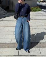 このブラウスをインナーとボトムスのワンツーコーデにさらっと羽織るだけで、手持ちアイテムの格上げが気軽にできそうです。黒の上下に合わせても、淡いブルーストライプが軽やかさと清潔感をプラス。インナーをシンプルにすることで、フリルの甘さが程よく引き算され、落ち着いた大人のカジュアルスタイルが完成します。