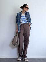 柔らかなカラーのTシャツと、ワイドシルエットのイージーパンツを合わせたナチュラルな雰囲気の着こなし。コーデ全体で作るこなれ感とおしゃれな配色で、頑張ってないのにセンスある雰囲気に。パンツは表情のある素材を使っているので、シンプルでも単調に見えない点が◎ アクセサリーで上品なポイントを加えるのが、きれい見えするコツかも。