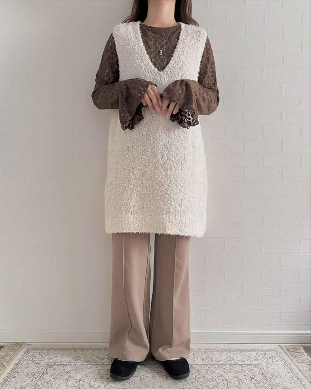 秋冬のトレンドとして注目を集めているレースシャツと合わせれば、フェミニンなムードが漂う最旬コーデに。ホワイトとブラウンの組み合わせも上品です。ざっくりとしたVネックのベストなので、襟元にデザイン性のあるインナーと合わせるのもおすすめ。甘くなりすぎないよう、きちんと感のあるパンツを投入して大人っぽく仕上げて。