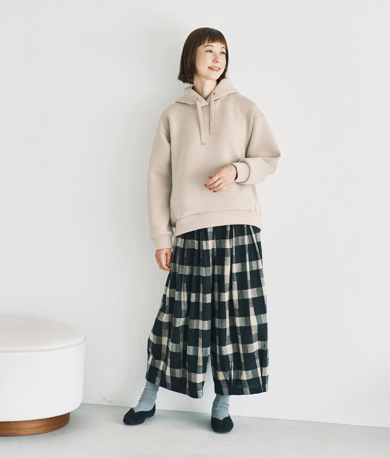 大人に似合うやわらかなベージュのパーカーを使ったコーデ。滑らかそうな表面感でカジュアルになりすぎず、上品な印象もキープできるかも。体型を拾いにくいシルエットも高評価。合わせたパンツは大胆なチェック柄ながらも、落ち着いた配色なので派手見えしにくいはず。タックでボリュームを出しつつも裾がコンパクトにまとまっており、こなれたシルエットを楽しめそうです。