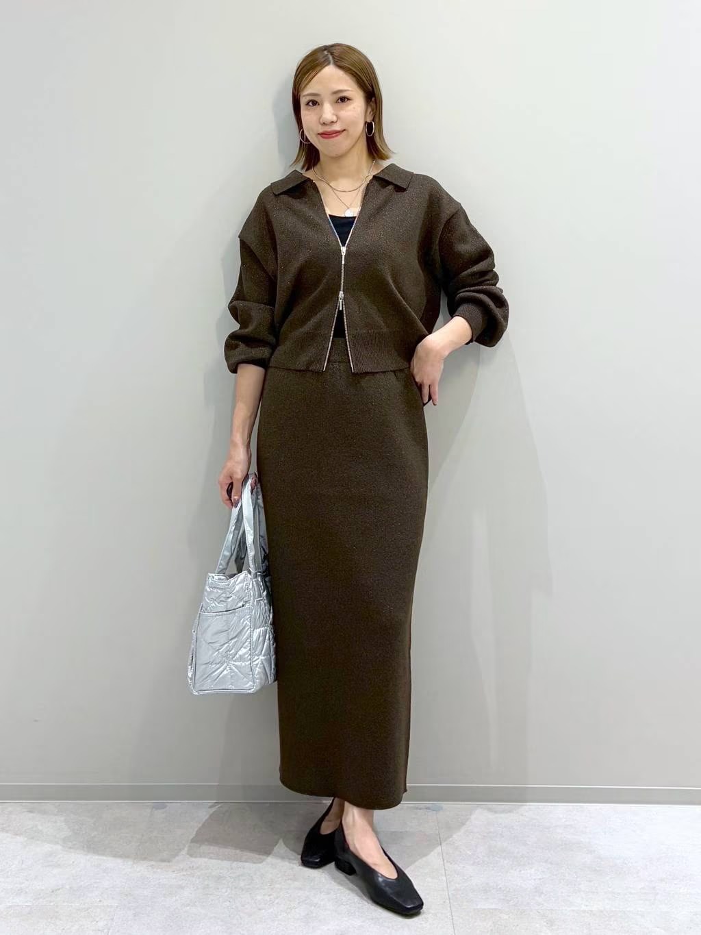 ショート丈のジップアップカーディガンと、Iラインスカートが好バランスなシルエットを作るセットアイテム。デザインはシンプルながら、さりげないラメ入り素材が上品です。カーディガンはダブルファスナーなので、うまく調整して抜け感をプラスするのがおすすめ。ブラウン・ブラック・チャコールグレーの全3色展開です。
