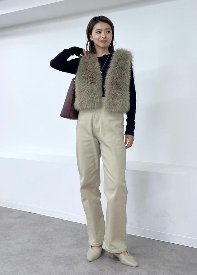 ふんわりとしたフェイクファーが、華やかなベスト。ボリュームがありながら、コンパクトなショート丈ですっきりと着られそうです。ダークブラウン・ベージュという上品な色展開も、大人女性に嬉しいポイント。黒のカットソーと合わせたクールな着こなしのほか、ボウタイ付きのブラウスに重ねてフェミニンに仕上げるのもおすすめです。