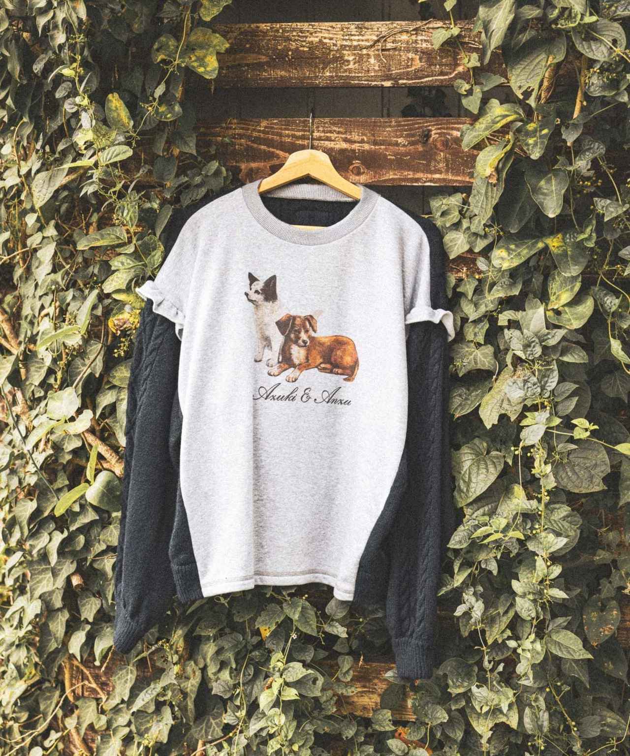 スウェットとニット素材をミックスした、遊び心のあるデザインのトップス。フロントにはレトロなワンちゃんのイラストが描かれており、1枚で存在感を放ちます。ニットとの切り替え部分のフリルのおかげで、カジュアルながらも女性らしいコーデに仕上がりそう。落ち着いた配色だから大人のデイリーコーデにマッチしやすく、秋冬のスタイリングで大活躍の予感です。