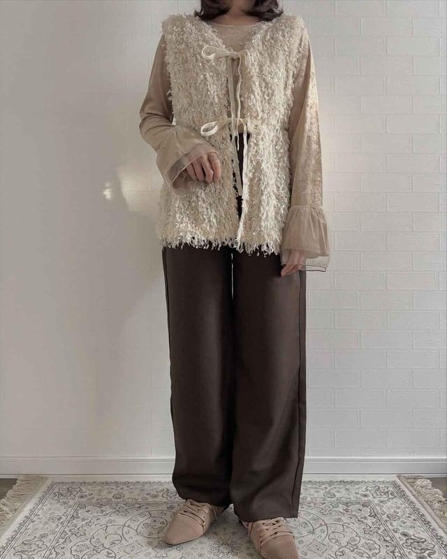 ウエストからふわりと広がるペプラムシルエットのジレは、一点投入でフェミニンなムードをまとえそうです。@chii_150cmさんによると「ペプラムシルエットで、気になる腰まわりをカバーしてくれる」とのこと。もけもけのフリンジが、華やかに秋冬ムードを盛り上げてくれる予感。