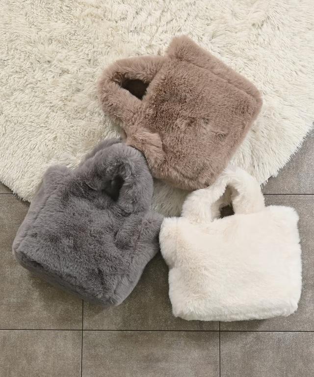 本体からハンドルまで、ふわもこのフェイクファーで覆われたこちらのバッグは、まるでぬいぐるみのようにキュートな雰囲気。なめらかな質感のフェイクファーは、大人のきれいめコーデにもマッチしそうな上品さです。取り外しできるチェーンストラップが付いているので、ショルダーバッグとして使えて両手が空くのも便利!