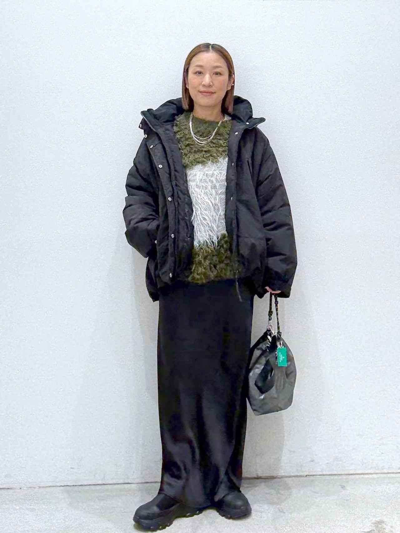 こちらは色違いのブラックを着用したコーデ。インナーにはモケモケ感のあるセーターを合わせて、冬ムード満点な装いに。アウターは少しボリューム感が出やすいので、細身のスカートやすっきりとしたパンツでメリハリをつけると上品に仕上がります。セーター以外をブラックで統一するのも、大人っぽく見せるポイント。顔まわりをすっきりさせたいときは、フードを取り外して着用するのがおすすめ。