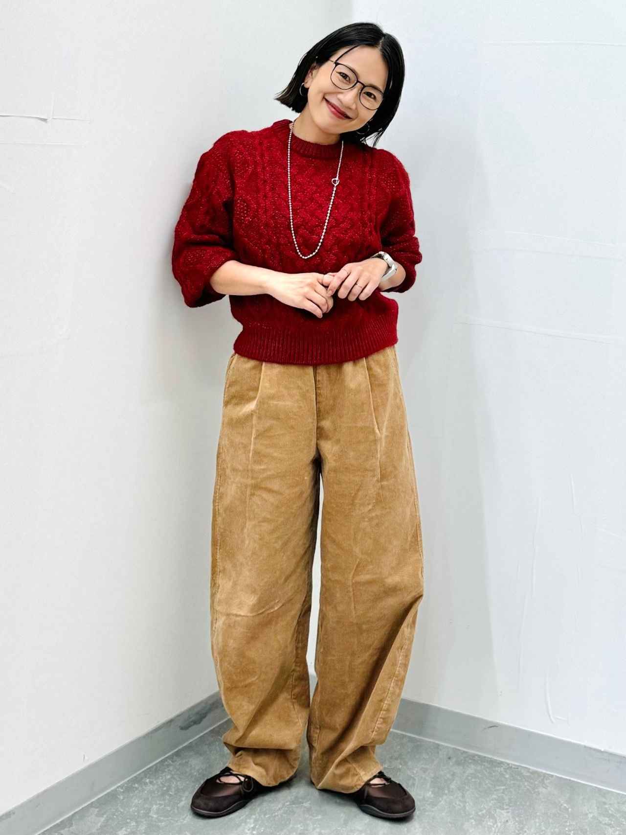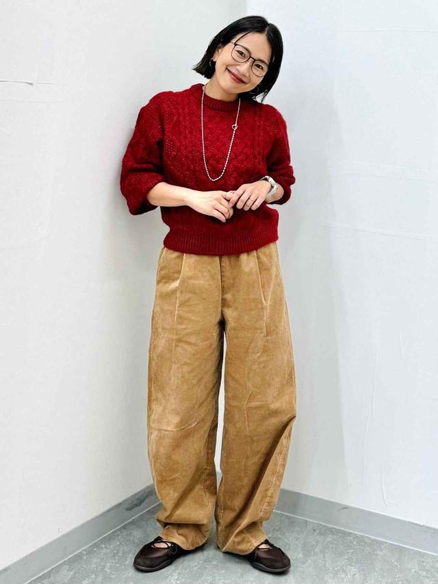 カジュアルなコーデに取り入れやすい、明るいブラウンのバレルパンツ。トレンドのシルエットと季節感のあるコーデュロイ素材が、着こなしの鮮度を高めてくれます。ウエストは総ゴムなので、楽に穿けそう。ブラウンと好相性のレッドのセーターを合わせれば、あたたかみのあるコーデが完成。