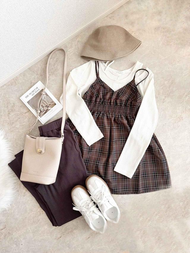 ふわっと広がるAラインで、コーデにちょうど良い甘さをプラスできそうなキャミブラウス。胸下のギャザーはウエストまわりを自然にカバーしつつ、フェミニンなムードを演出します。落ち着いたトーンのブラウンチェックなので、甘くなりすぎないバランスも絶妙。インナーやボトムス次第でカジュアルにもきれいめにも振りやすい、使い勝手の良さも魅力です。