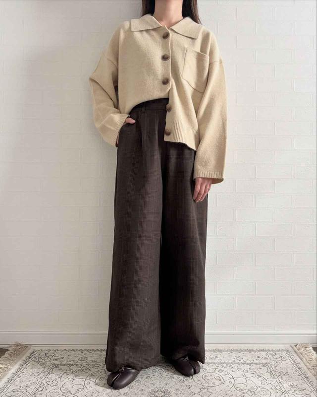 脚のラインを拾いにくく、ストンと落ちるデザインが魅力のストレートパンツ。フロントタックで腰まわりにも余裕があり、美シルエットが作りやすい優秀アイテムです。落ち着いたチェック柄は大人コーデで取り入れやすく、シンプルなトップスに合わせるだけでコーデがサマ見えしそう。インフルエンサーの@chii_150cmさんも「めちゃくちゃ合わせやすくて着まわし力抜群」とコメントしています。