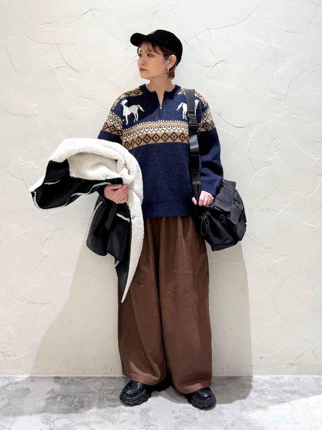 牧場をモチーフにした、牧歌的な雰囲気漂うセーター。ネイビー・グレー・アイボリーの3色展開でそれぞれ柄が異なり、思わずイロチ買いしたくなるかも。華やかな柄が存在感を放ち、シンプルなワンツーでもこなれ見えが狙えます。ハーフジップで首元のアレンジが楽しめるので、マンネリになりにくいのが嬉しいポイント。1枚でゆるっと着こなしたり、タートルネックをレイヤードしたり、幅広い着こなしが楽しめそうです。