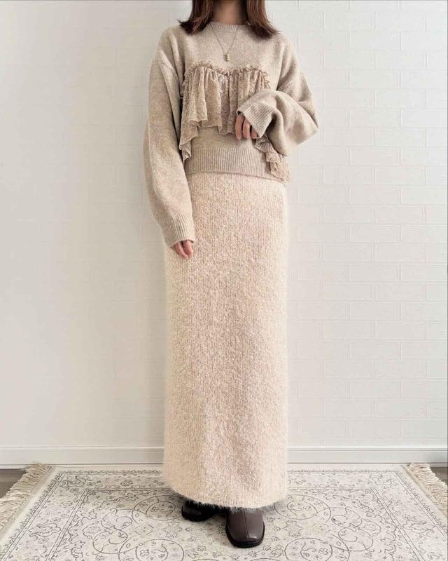 @chii_150cmさんが「ほんのり上品に煌めく」「着回し力抜群」と紹介するのは、一点投入で上品さをまとえそうなナロースカート。ふんわりとした冬らしい素材感も魅力です。淡色のセーターと合わせた女性らしい着こなしのほか、クールな黒のトップスでキリッと引き締めるのも◎