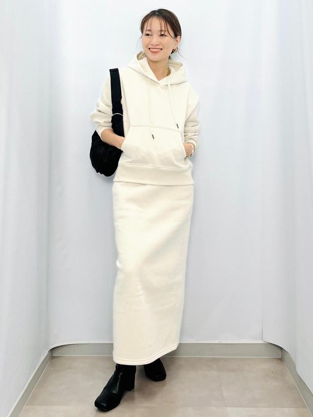 こちらはセットアップ可能なパーカとナロースカート。カジュアルなスウェット素材のアイテムですが、スラリとしたナロースカートが女性らしいコーデに導いてくれます。ホワイト系のワントーンで統一することで、清潔感のある好印象な着こなしに。膨張しやすい淡色コーデは、濃色の小物で引き締めるのが完成度を高めるカギ。