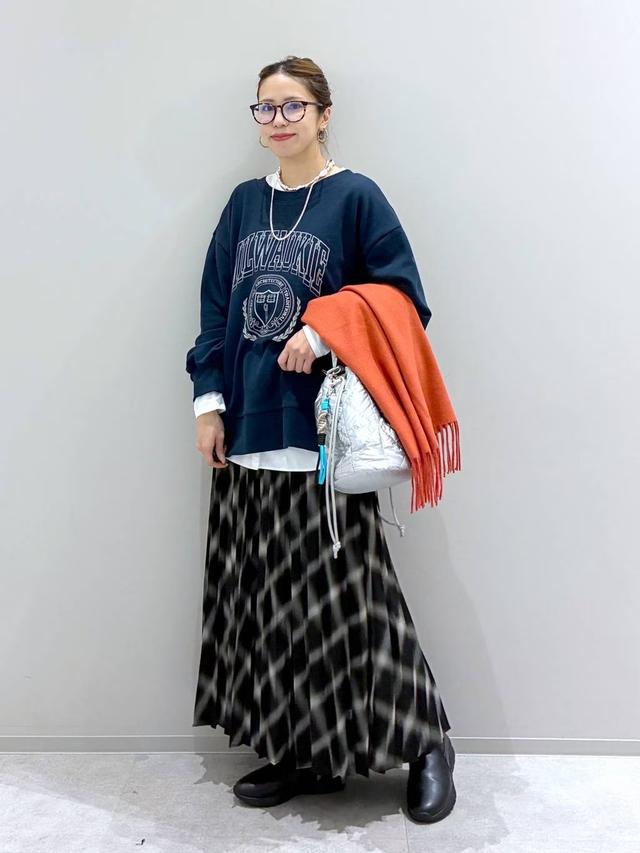 こちらは無地のミドルグレーを着用。プリーツディテールが華やかなので、シンプルなワンツーでもサマになるのが嬉しいポイント。きれい見えが狙えるハイネックのセーターを投入すれば、アイボリー × ミドルグレーの配色も相まって、女性らしく上品な冬コーデに。ネックレスなどのアクセで華やぎをプラスすると◎