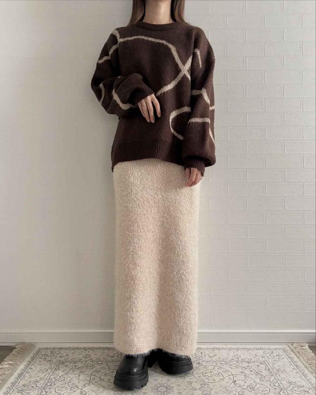 ふわっとしたシャギー素材で、コーデを華やかに演出できそうな高見えスカート。デザインはシンプルなので、存在感のある柄入りのセーターとも好相性です。ウエストゴムで楽ちん、バックスリット入りで足さばきがよさそうなのも高ポイント。「とても合わせやすくて着回し力抜群」と@chii_150cmさんもお気に入りのようです。