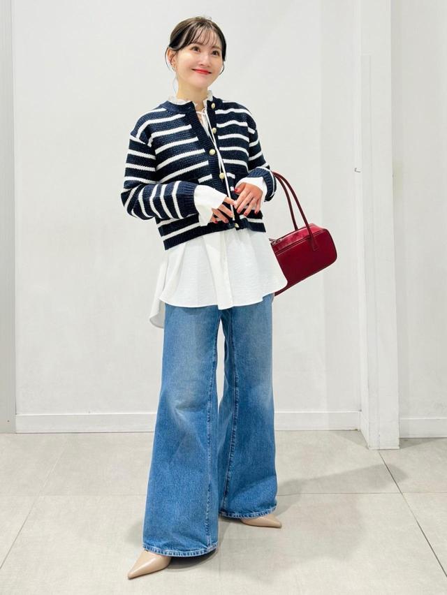 ネイビーのボーダーカーディガンは、ツイードライクな編地やゴールドボタンが上品見えのポイント。ジーンズと合わせてもカジュアルに寄りすぎず、どこか品のある着こなしが完成します。インナーに白を効かせれば、明るさもプラスされて好印象。きちんと見えを狙いたい大人カジュアルにもぴったりです。