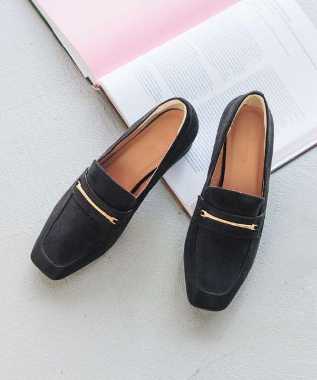 足をしっかり覆う深めのアッパーが特徴で、4.5cmヒールながら、安定感のある履き心地を実感できそうなローファー。しかも、公式オンラインストアによるとクッション性も高いとのこと。キラッと光るゴールドカラーのパーツがエレガントな雰囲気を演出。一点投入で、トレンドのトラッドムードを醸し出せそうです。すっきりとしたスクエアトゥが洗練された印象を与え、お仕事やセレモニーシーンにも重宝しそうです。