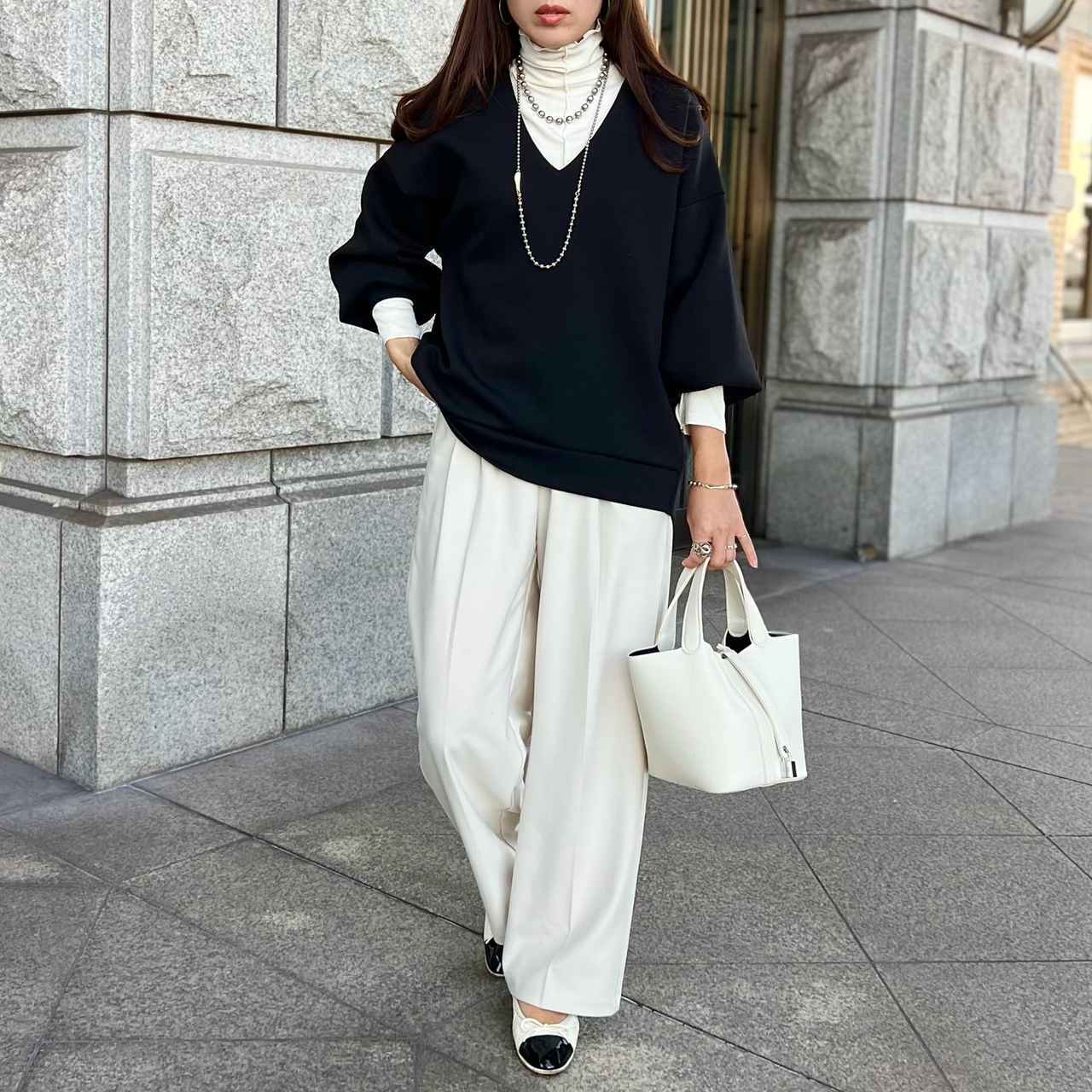 全体をモノトーンでまとめたきれいめカジュアルコーデ。上下ゆったりめのアイテムの組み合わせでもすっきりとした印象なのは、パンツのタックや縦ラインを作るセンタープレスのおかげ。脚のラインを拾いにくいワイドシルエットが体型をカバーしながら抜け感を作り、大人の余裕を感じるスタイリングに仕上げてくれます。
