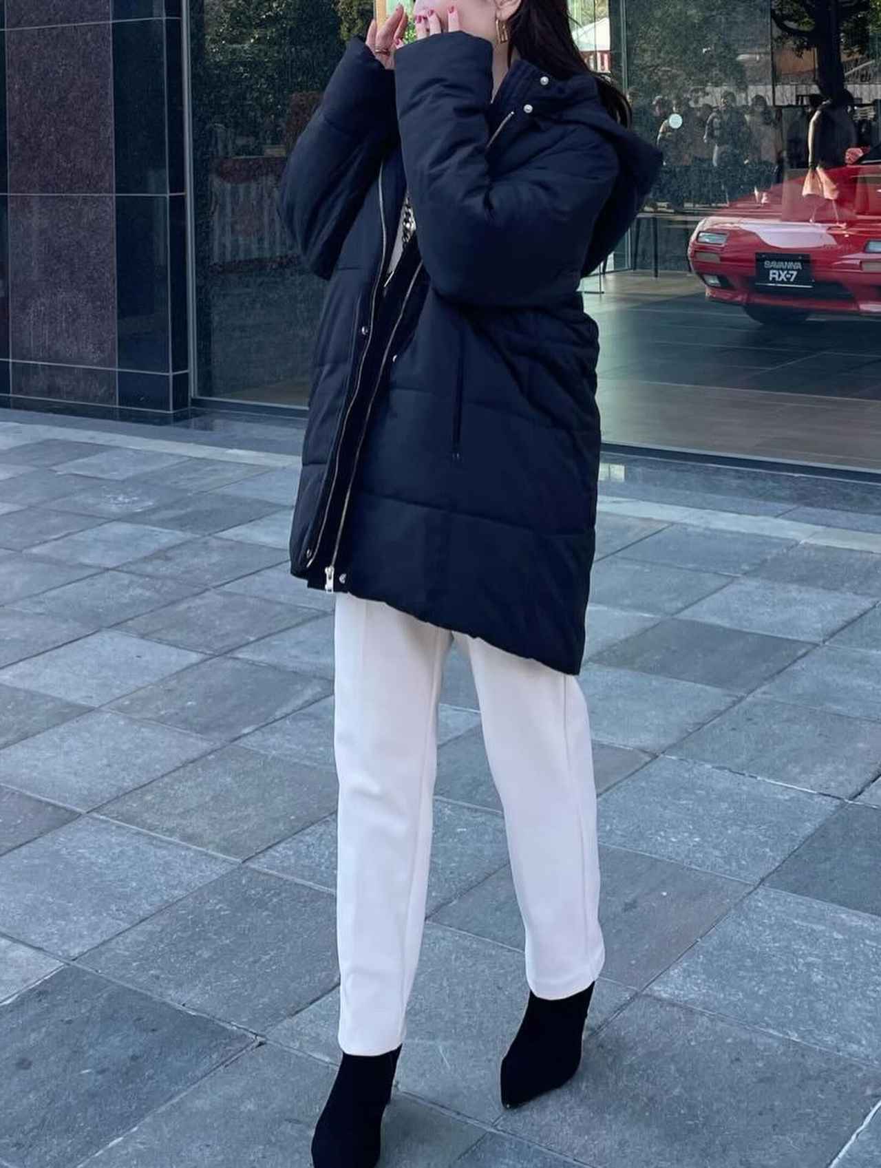 着膨れが気になる中綿アウターも、ダークトーンを選べば引き締め効果でスッキリとした印象に。インフルエンサーの@eri_happylife1002さんが「ヒップまですっぽり隠れる丈感」とコメントするように、体型カバーと腰まわりの防寒もしっかり両立できそうです。
