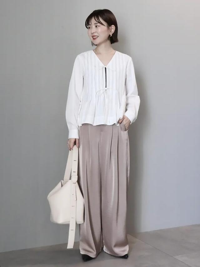 白のブラウスにサテンパンツを合わせたスタイルは、素材のコントラストで大人らしい品のよさが際立っています。淡色同士の組み合わせでも、パンツのツヤ感のおかげでぼやけにくく、きちんと感をキープ。ブラウスのすっきりとしたVネックと、ゆったりとしたパンツの対比でスタイルアップも狙えそう。バッグも淡色で揃えつつ、足元とインナーはブラックで引き締めてメリハリを出して。