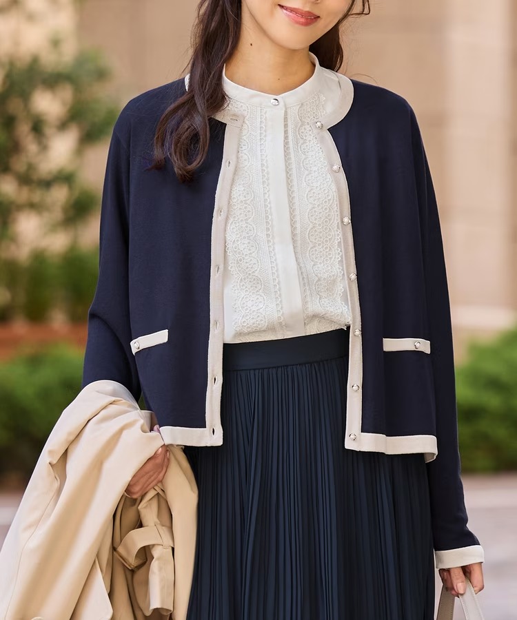 上品な配色使いがポイントのクルーネックカーディガン。高級感のあるパール調ボタンも、フェミニンな雰囲気を漂わせます。ハイゲージで編み上げたニット素材で、お仕事シーンにもぴったり。UVカット機能が付いているため、紫外線が気になるこれからの季節に手放せなくなりそうです。