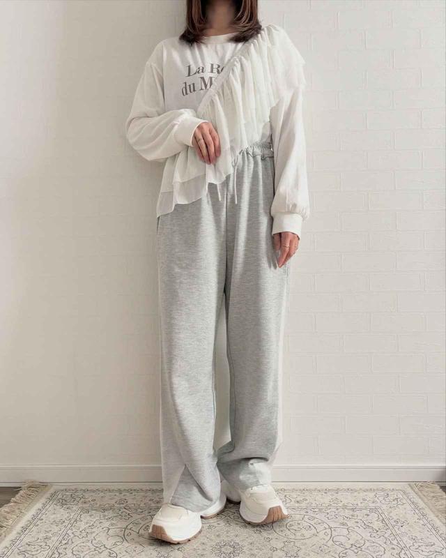 ゆったりとしたシルエットで、リラックス感のあるスウェットパンツ。裾にかけて広がる切り替えデザインが、脚のラインを綺麗に見せてくれそう。ウエストはさり気なくメロウデザインになっており、可愛らしいワンポイントに。しまむら好きのインフルエンサー@chii_150cmさんによると「カジュアルになり過ぎず女性らしく穿ける」とのことで、カジュアルでもきれいに見せたいミドル世代にもおすすめの一本です。