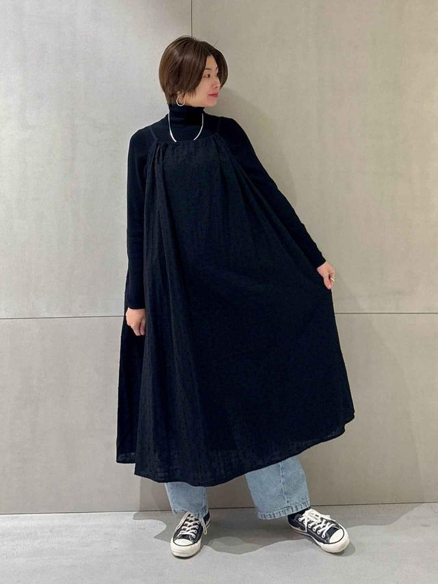 柔らかいガーゼ生地を使ったキャミワンピース。ふわっと広がる軽やかなシルエットで、フェミニンなムードをまとえそう。ドビー織りによる立体的なドット柄も、華やかなアクセントに。肩紐は後ろでリボンになっており、身長に合わせて長さを調節できます。タートルネックTシャツと合わせて上品に仕上げるほか、デニムジャケットを羽織って爽やかに着こなすのもおすすめ。